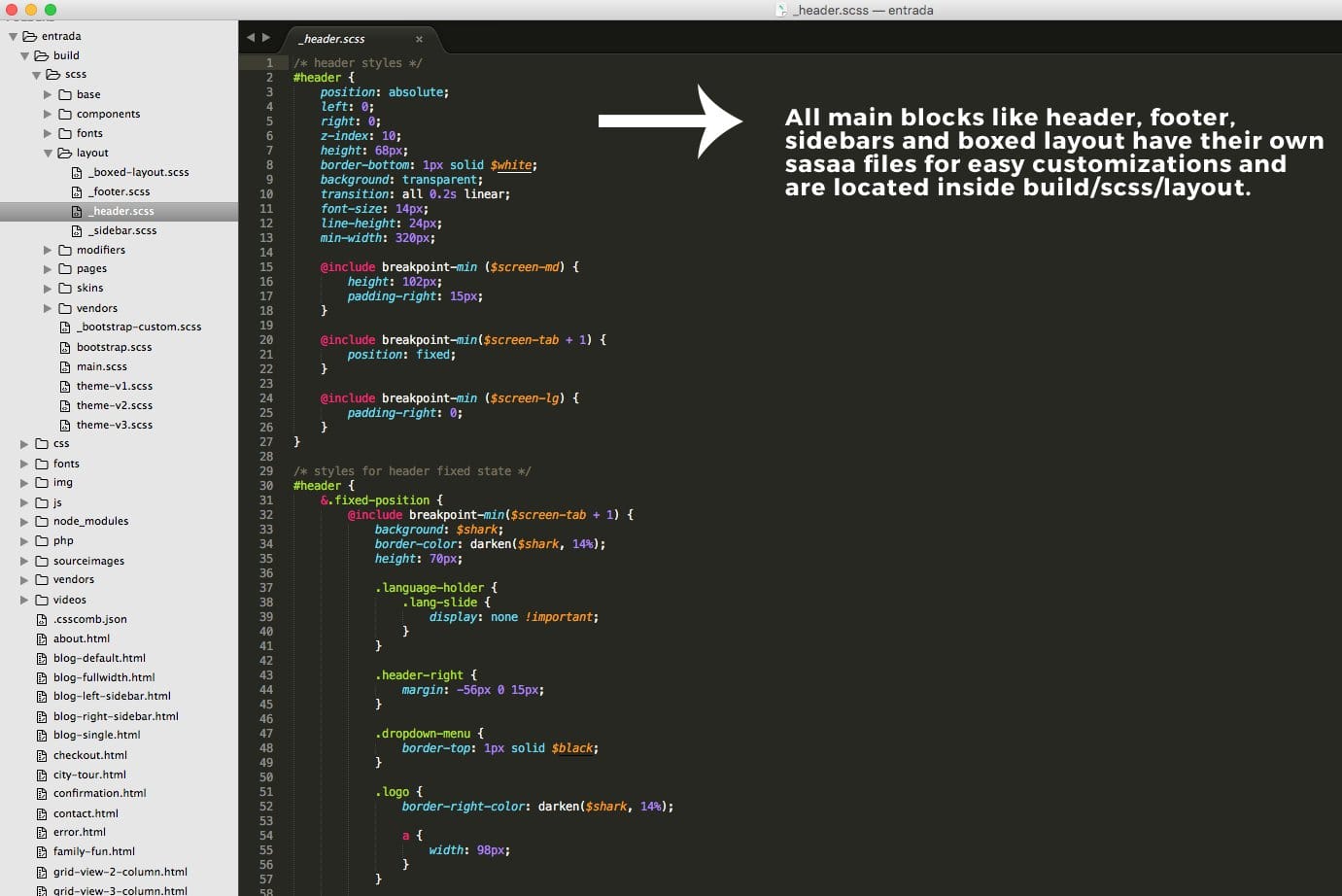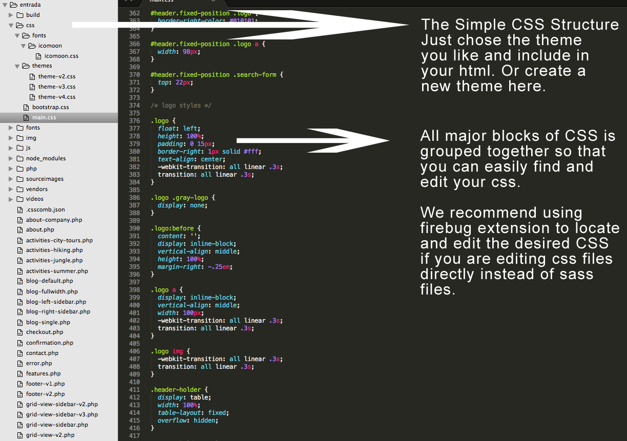 Using sass gives you ultimate control over editing the site template. You can switch color schemes, typography etc. site wide in seconds, often editing one line of code. To use this method, you should have node and grunt installed in your system and put your html folder "entrada" in mamp or xampp folder and ensure that mamp/xampp is running.