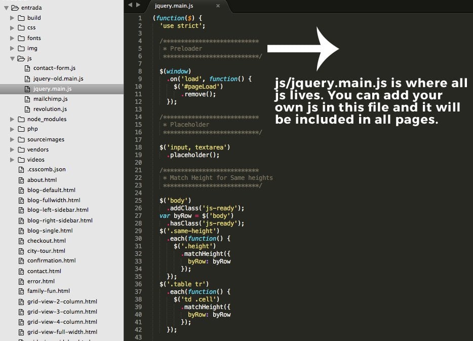 Once you purchase and download the theme - unzip the folder and you will find a folder called Entrada. Inside this folder, there are 3 folders named "entrada", "documentation" and "PSD". The main html working folder is "entrada". An overview of the folder structure is given below.