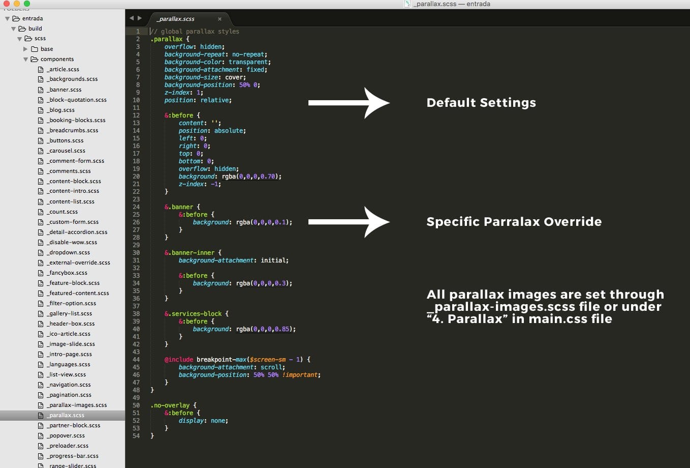 All parallax settings are inside build >> scss >> components >> _parallax.scss Similarly, all parallax background images are inside build >> scss >> components >> _parallax-images.scss