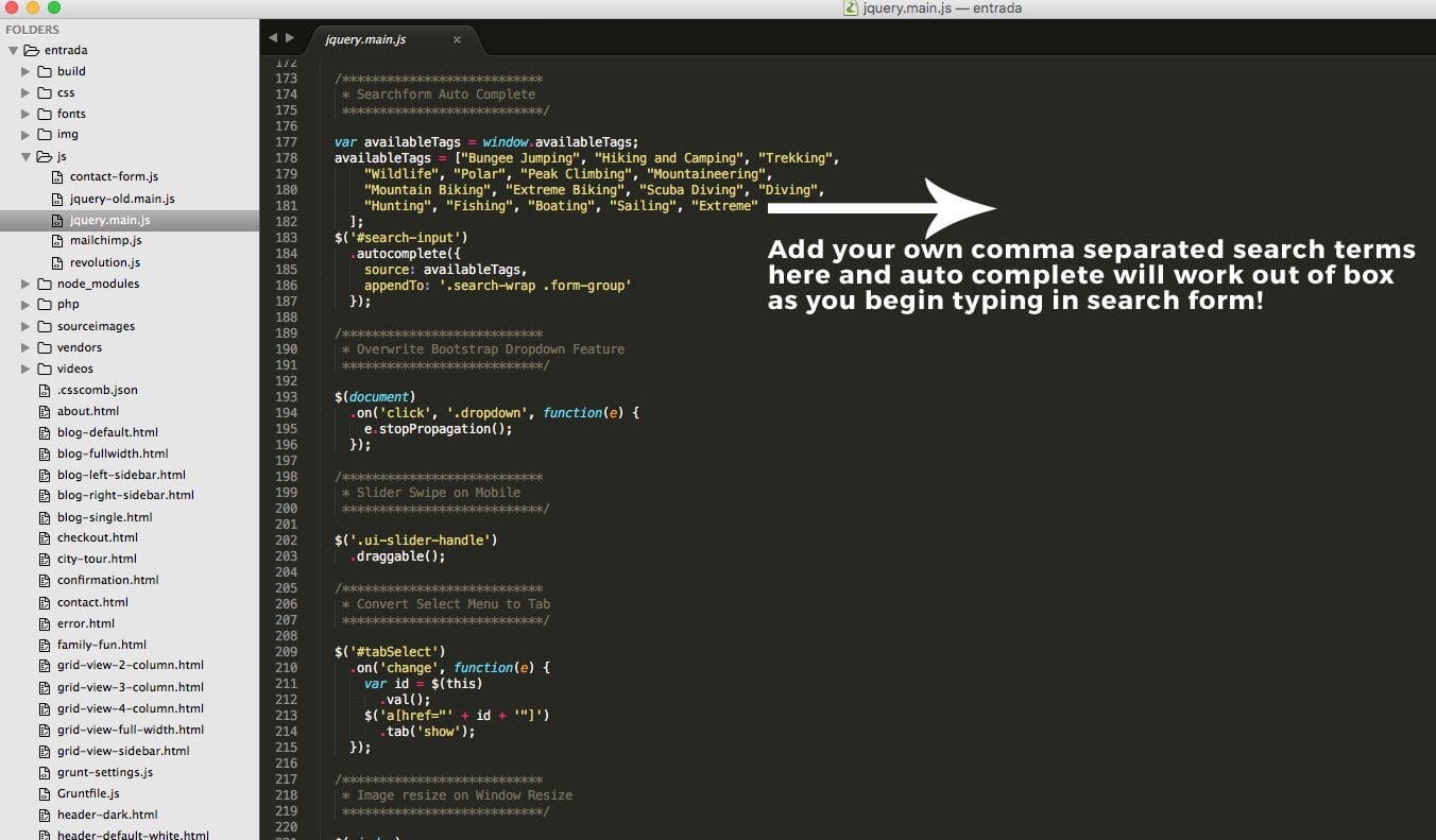 The search form with auto completion has autofill property already configured. To add tags that people can use to search the site - please go to js >> jquery.main.js and around line 92, add or edit the tags to populate search form suggestions during site search.